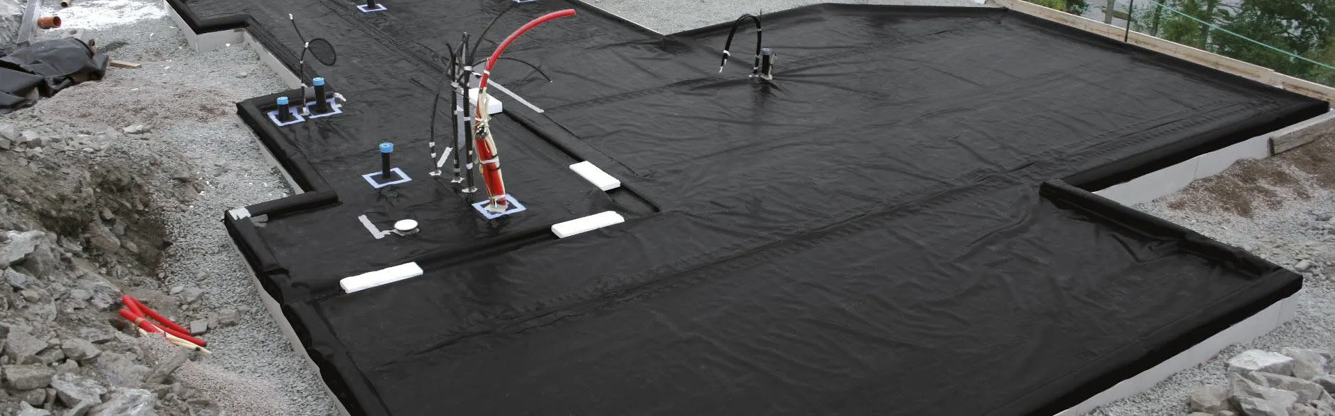 Sob a laje de betão e sobre substrato mineral compactado: utilizado um geotêxtil com no mínimo de 300 g/m² anti furo.